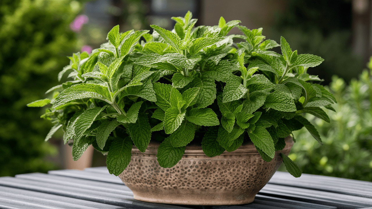 spearmint-plant-in-a-rectangular-planter in full sunlight